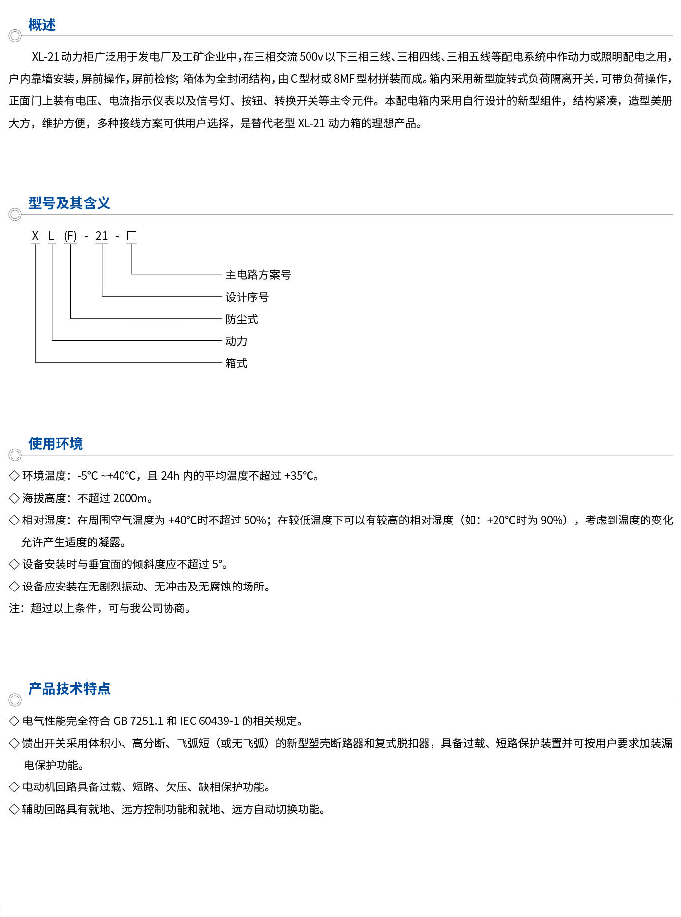 XL-21動力柜廣泛用于發(fā)電廠及工礦企業(yè)中,在三相交流500以下三相三線、三相四線、三相五線等配電系統(tǒng)中作動力或照明配電之用,戶內(nèi)靠墻安裝,屏前操作,屏前檢修;箱體為全封閉結構,由C型材或8MF型材拼裝而成。箱內(nèi)采用新型旋轉(zhuǎn)式負荷隔離開關.可帶負荷操作,正面門上裝有電壓、電流指示儀表以及信號燈、按鈕、轉(zhuǎn)換開關等主令元件。本配電箱內(nèi)采用自行設計的新型組件,結構緊湊,造型美冊大方,維護方便,多種接線方案可供用戶選擇,是替代老型XL-21動力箱的理想產(chǎn)品。
