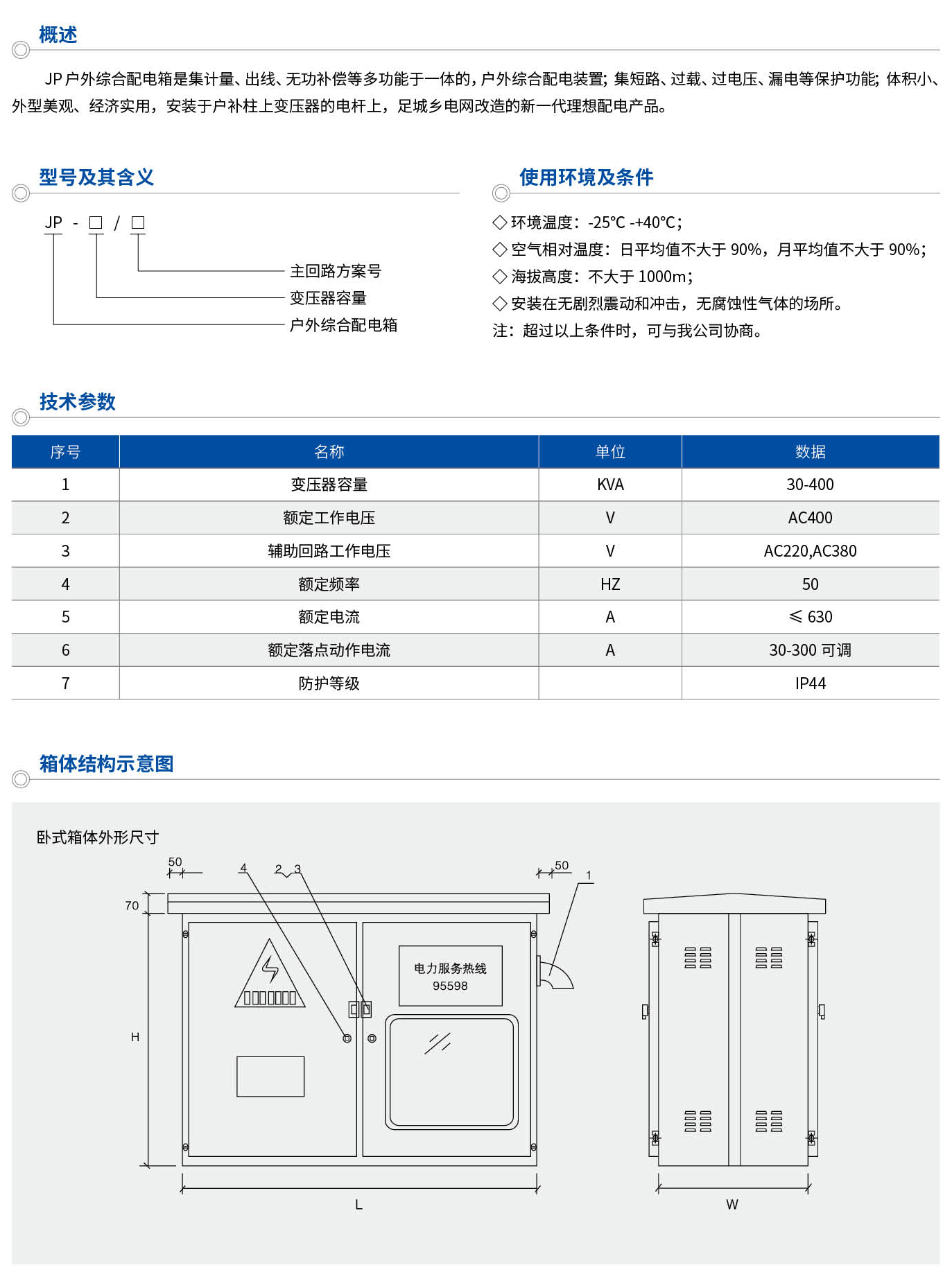 JP戶外綜合配電箱是集計量、出線、無功補償?shù)榷喙δ苡谝惑w的,戶外綜合配電裝置;集短路、過載、過電壓、漏電等保護功能;體積小、外型美觀、經(jīng)濟實用,安裝于戶補柱上變壓器的電桿上,足城鄉(xiāng)電網(wǎng)改造的新一代理想配電產(chǎn)品。